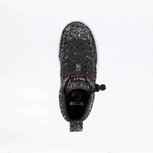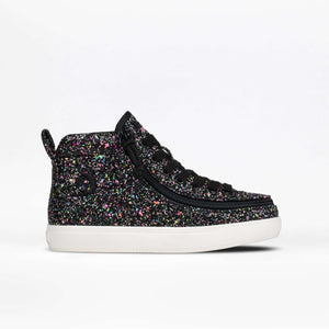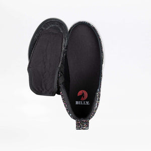 Built on our deeper and more resilient D|R II silhouette, these shoes offer extra room for adjustability and unmatched durability, perfect for all-day wear. The striking black glitter upper, sprinkled with colorful accents, adds a dazzling touch to any outfit. Designed with a fully opening upper for effortless entry, functional laces for a secure fit, and a wraparound zipper for ultimate convenience, the Black Multi Glitter BILLY Classic D|R II High Tops are as practical as they are stylish.